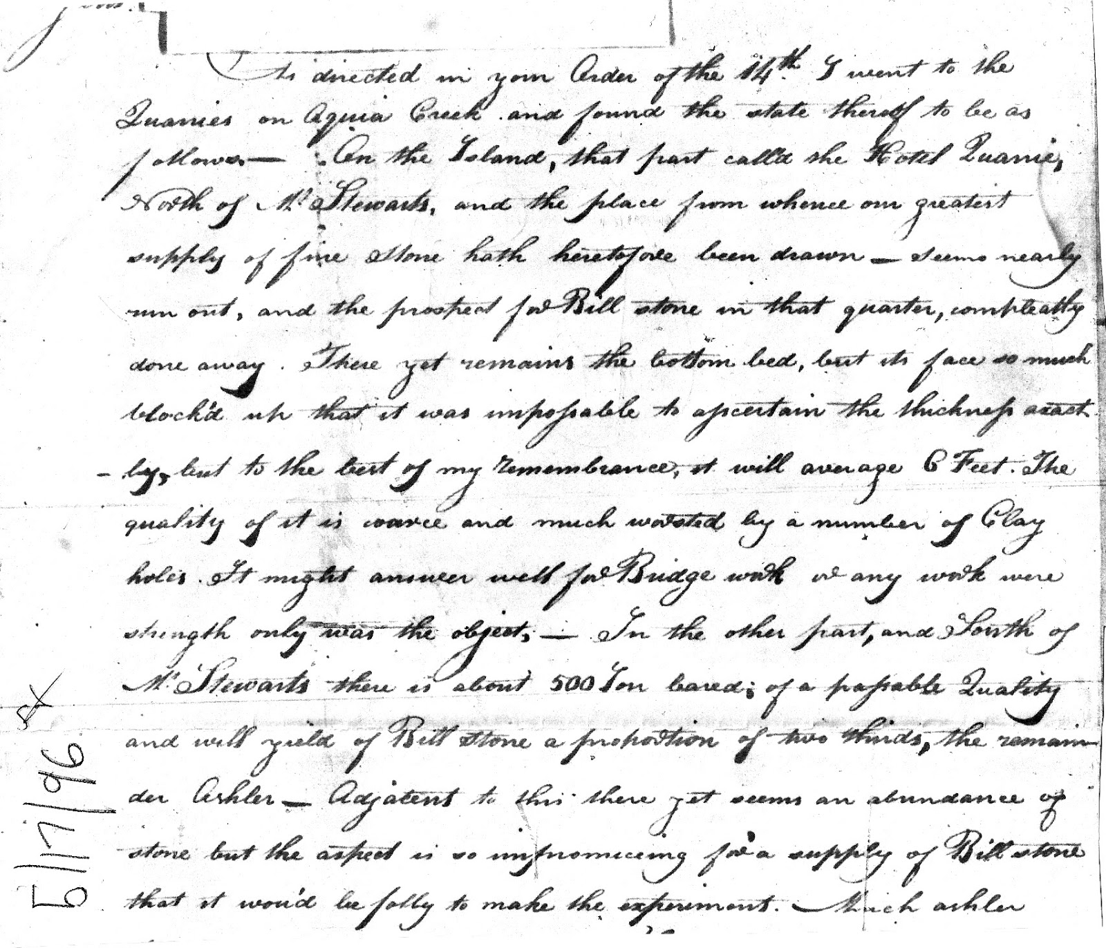 By 1798 the quarrying operations at Aquia had grown and the two letters below show how the stone cutters involved responded to the crisis when a ship with 40 tons of stone sank in Aquia creek. There is no mention of hired slaves in either letter. But the letters describe the crisis at the Brent quarry. The stone in the sunken ship had to off loaded and the ship raised. To get more stone from the quarry a layer of soil had to be removed. It is hard not to picture slaves doing such hard menial work. This was a quarry operated by the Brent family that had long owned slaves in Virginia.